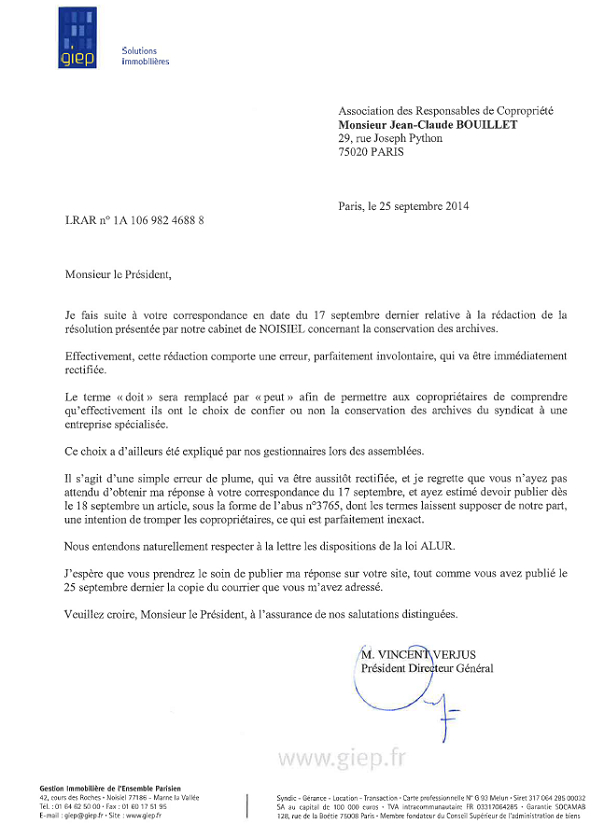 Suite à notre abus concernant les archives (voir : abus n° 3776 www.unarc.fr/qmx4) le PDG de la GIEP, lui-même, nous répond que si ses gestionnaires disent que le contrat d’archives est désormais obligatoire, c’est simplement une « erreur de plume »…